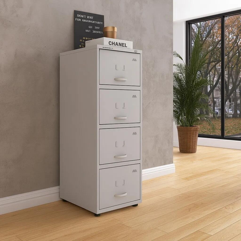 Ótima pedida para bancos, indústrias, escritórios em geral e até mesmo para ambiente domiciliar, que necessitam de organização e armazenagem de pastas, livros e todos os tipos de documentos. Possui 4 gavetas com patins de nylon e suporte para pastas, fundo reforçado e chave para tranca, pés com sapatas plásticas e reguladores de fácil manuseio.
